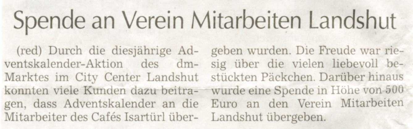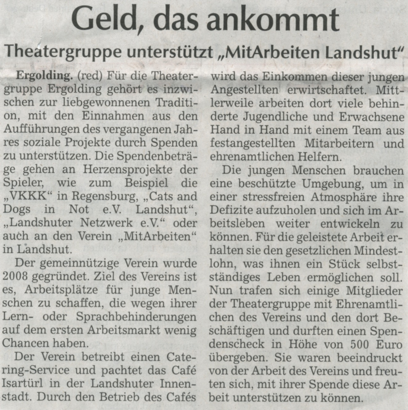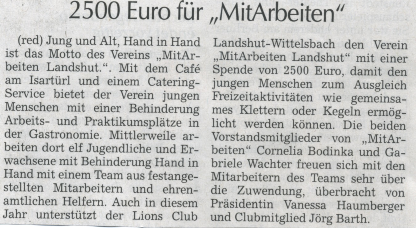Der Verein Mitarbeiten Landshut e.V. betreibt in Landshut das Café am Isartürl, das Regierungscafé und das Ämtercafé in den Räumen der Regierung von Niederbayern. Er hat sich zur Aufgabe gemacht, Menschen mit Behinderung, die für den ersten Arbeitsmarkt zu schwach sind, einen sicheren Arbeitplatz zu bieten, bei dem sie nach ihren Möglichkeiten arbeiten und sich vor allem individuell und im geschützten Rahmen weiterentwickeln können.